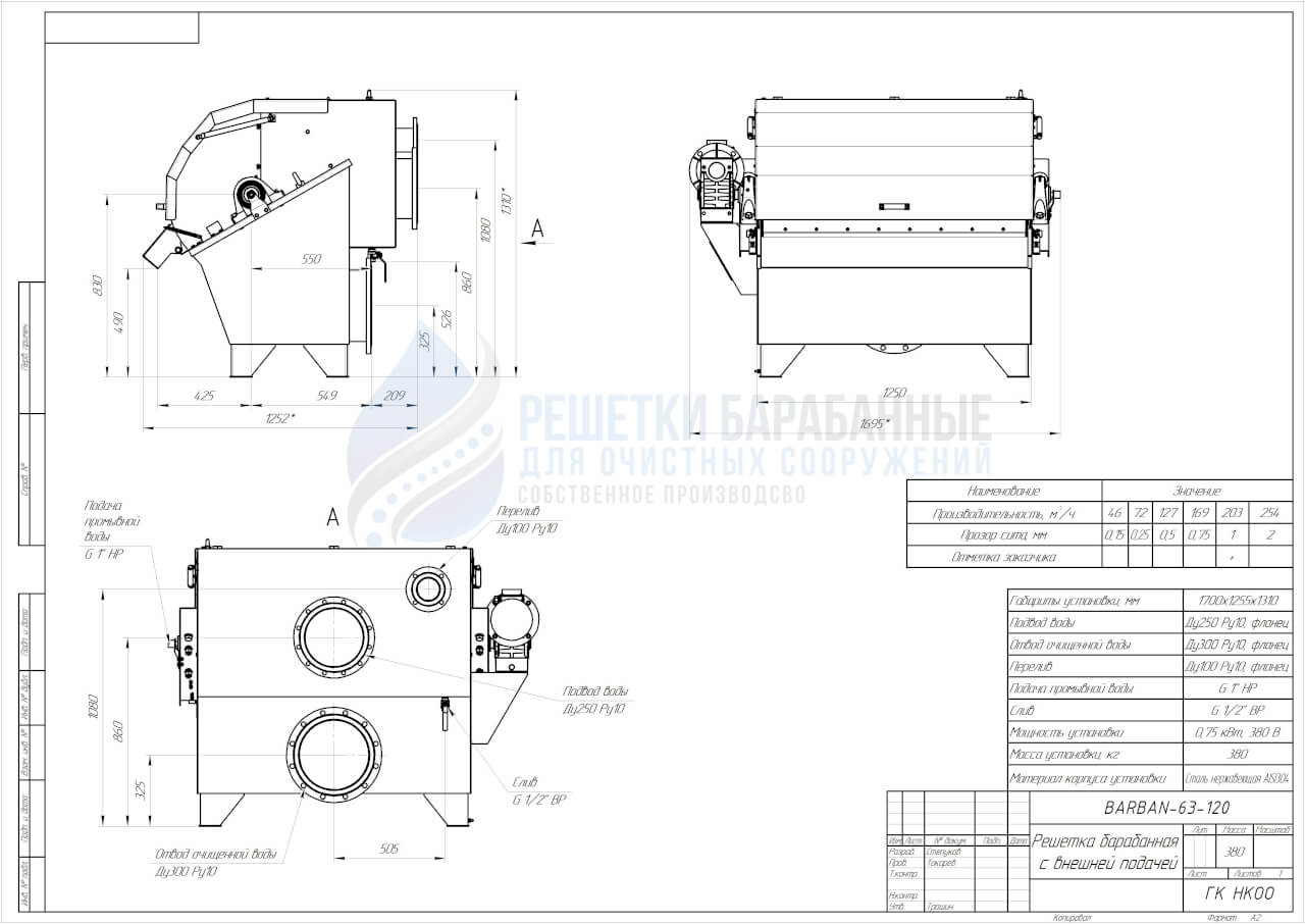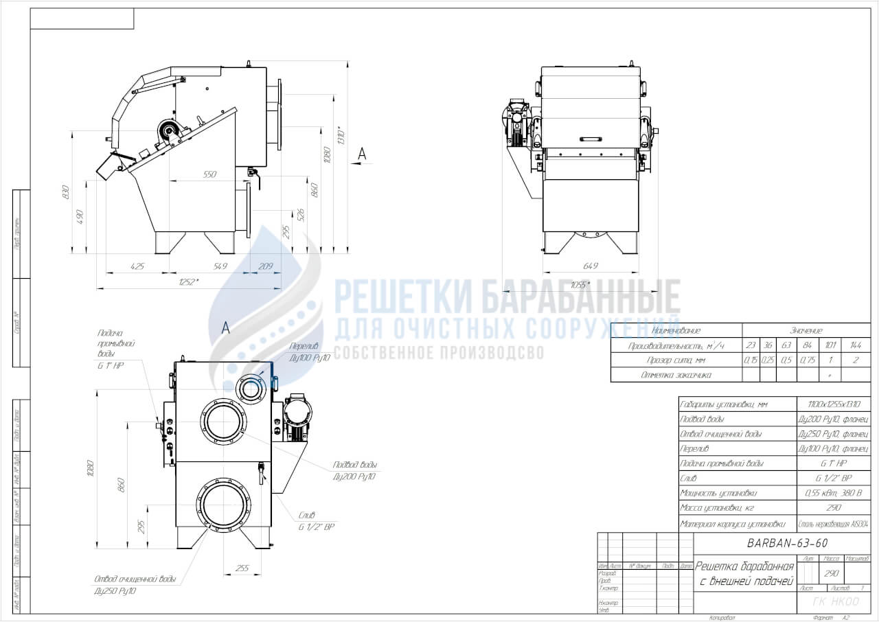 В передней части корпуса установки барабанной решетки (сита) закреплен барабанный фильтр при помощи подшипников. В задней части корпуса расположена накопительная часть установки, которая ламинарно распределяет поступающий поток.